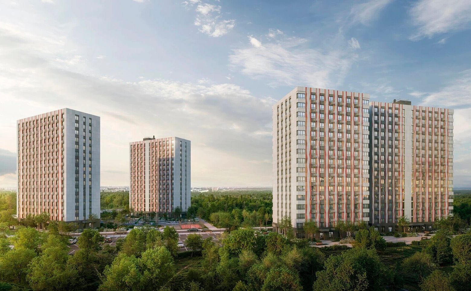 Жилой комплекс состоит из нескольких корпусов высотой до 15 этажей. Лаконичные фасады корпусов выполнены в светлых и темных оттенках. Всего проект занимает площадь 44,6 га.