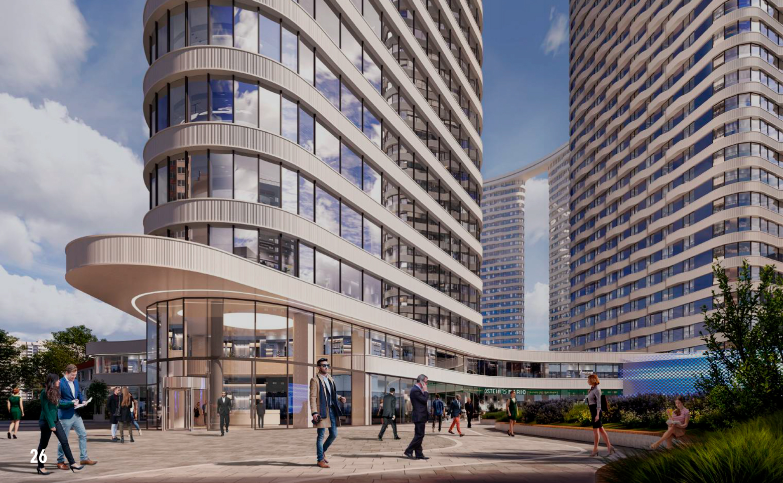 Проект включает в себя 6 высотных зданий: пять жилых корпусов и деловой центр. Здания достигают высоты 30–31 этажа. Архитектура выполнена по монолитной технологии строительства, а фасады облицованы керамогранитом. Здания объединены общим стилобатом. Проект вдохновлен биологическими формами.